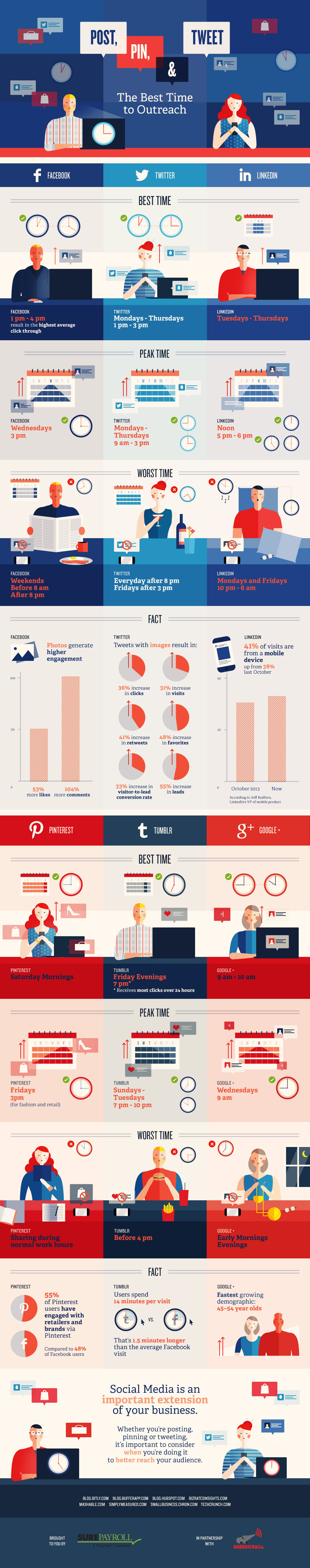 De acuerdo con la infografía a continuación a través del servicio de nómina en línea SurePayroll, los sábados son los mejores para Pinterest y que ni siquiera debería molestarse con Tumblr antes de 16:00
