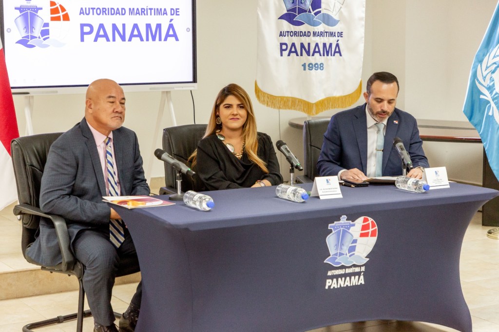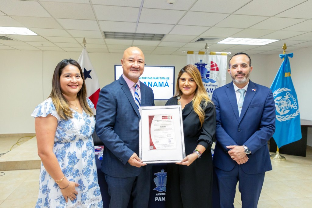 Participaron del acto de entrega de la certificación, la Subadministradora de la AMP, Elvia Bustavino, el Director General de la DGMM, Capitán Juan Maltez y el Gerente Regional de Operaciones de la Rama Marina para América Latina Norte, de Bureau Veritas Panamá S.A., José Aurelio Chong.