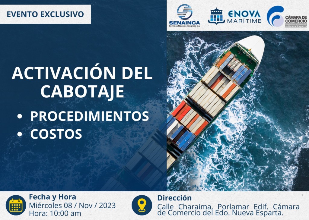 Te invitamos cordialmente a una presentación de *»La Activación del Cabotaje en Venezuela»* en su modalidad online y presencial del día 08/11/2023, a las 10:00 am. *Sede*: Cámara de Comercio de Nueva Esparta. Link para el Google Meet*: https://meet.google.com/jgm-igzj-pfc